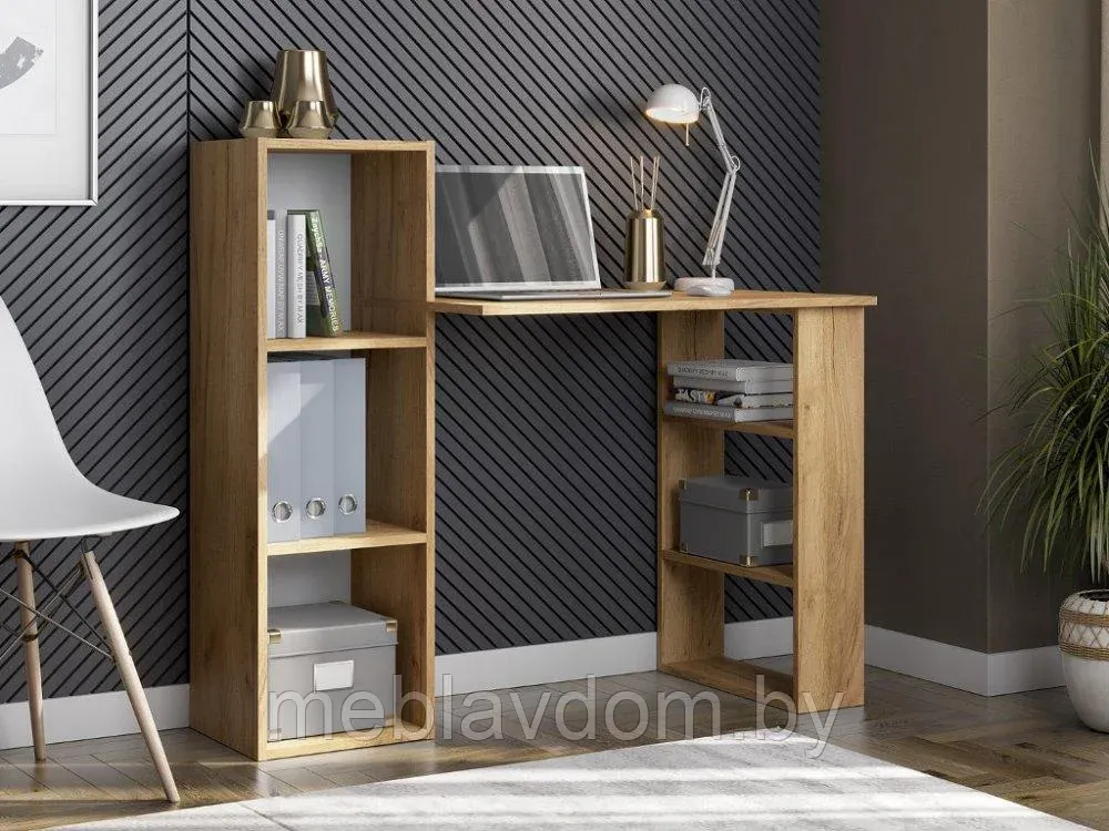 Компактный компьютерный стол со столешницей размером 822х493 мм. С одной стороны столешница опирается на открытый стеллаж размером 150х734х460 мм с двумя полками. С другой стороны столешница пристыковывается к открытому пеналу размером 328х1026х296 мм также с двумя полками. Стол можно собрать на любую сторону. Максимально допустимая нагрузка на столешницу 15 кг, на полки 5 кг.